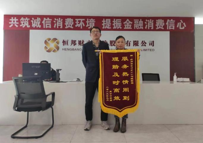 恒邦保险河南分公司扎实开展多种形式的“3·15”教育宣传活动。3月15日,分公司理赔部收到三责伤者家属送来的一面印有“服务热情周到 理赔及时高效”锦旗,对河南分公司高效快捷的服务给予高度赞扬。