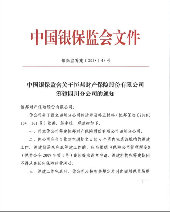 2018年10月26日,|168飞艇官网四川分公司获中国银保监会批准筹建,这是恒邦保险在全国获批筹建的第五家省级分公司。